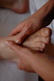 Fußsohle, Fußrücken, sowie die Knöchel bis zum Unterschenkel werden punktuell massiert.
